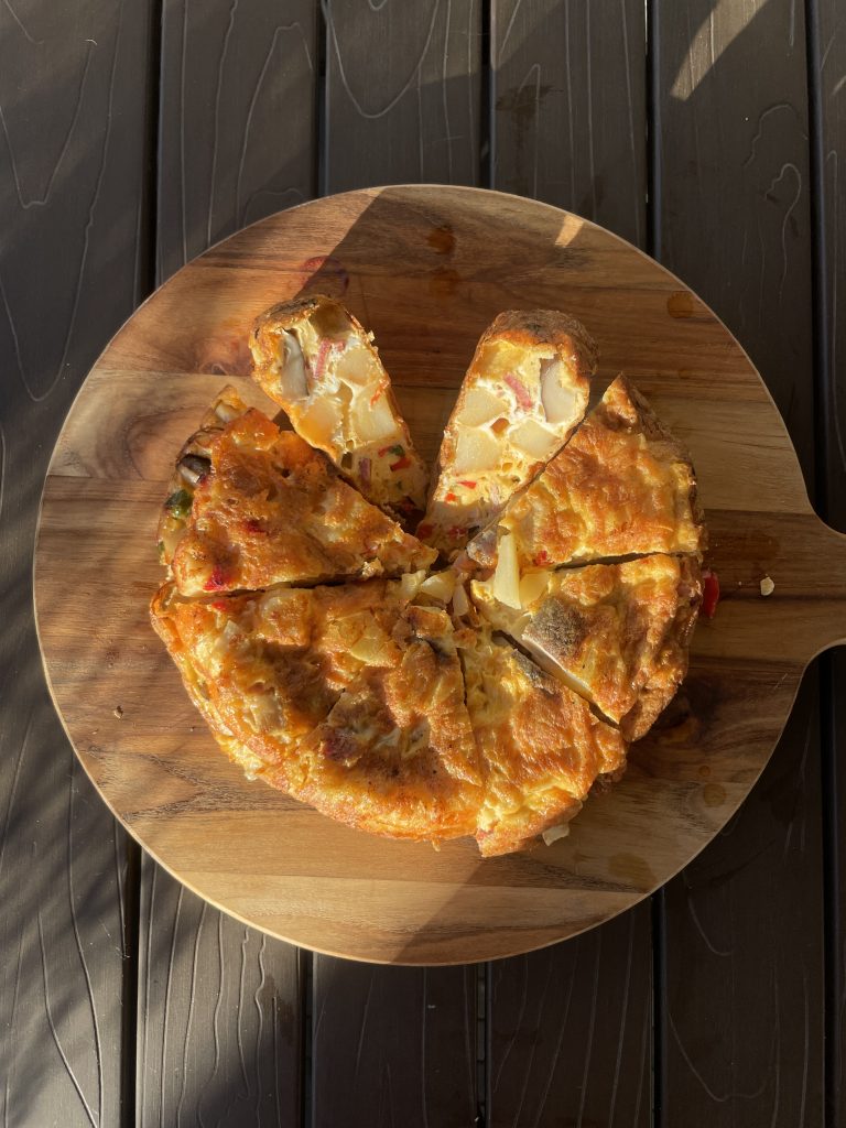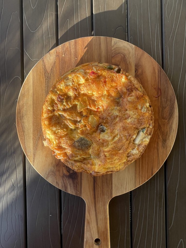 そのあと、ベーコン、パプリカ、エリンギ(重要)いんげんなどを炒め、溶き卵6個分を流し入れて、シュレッドチーズを乗せて蓋をする。味付けはゲランドの塩とクラタペッパーのみ。コンソメなどを入れてもok!