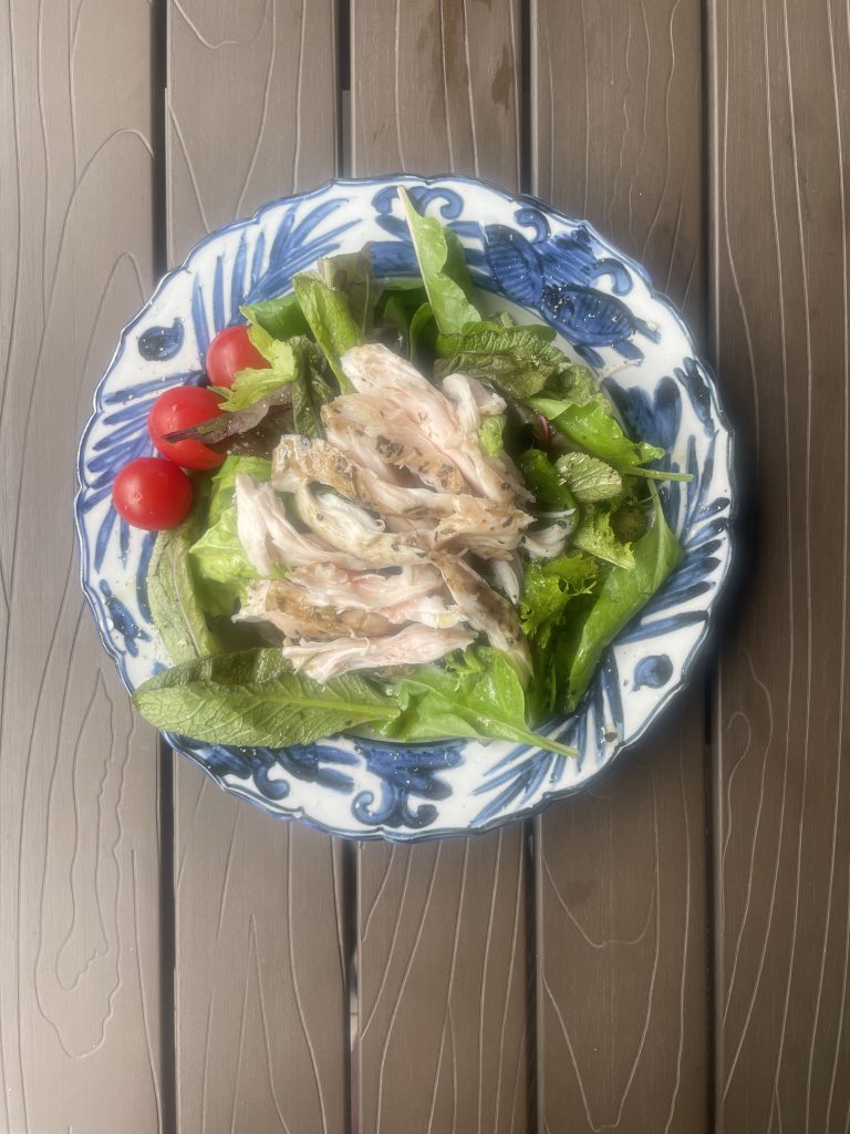 その上に手で割いたチキンを乗せて、葉っぱにチキンを巻いて食べるか、塩と胡椒、お酢、ブラックペッパーの味にする時もあります。