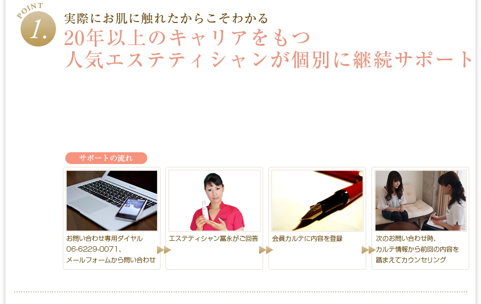 サロンで実際にお肌に触れた経験と知識から、トラブルの把握~適切なスキンケアのご提案まで、エステ歴20年大